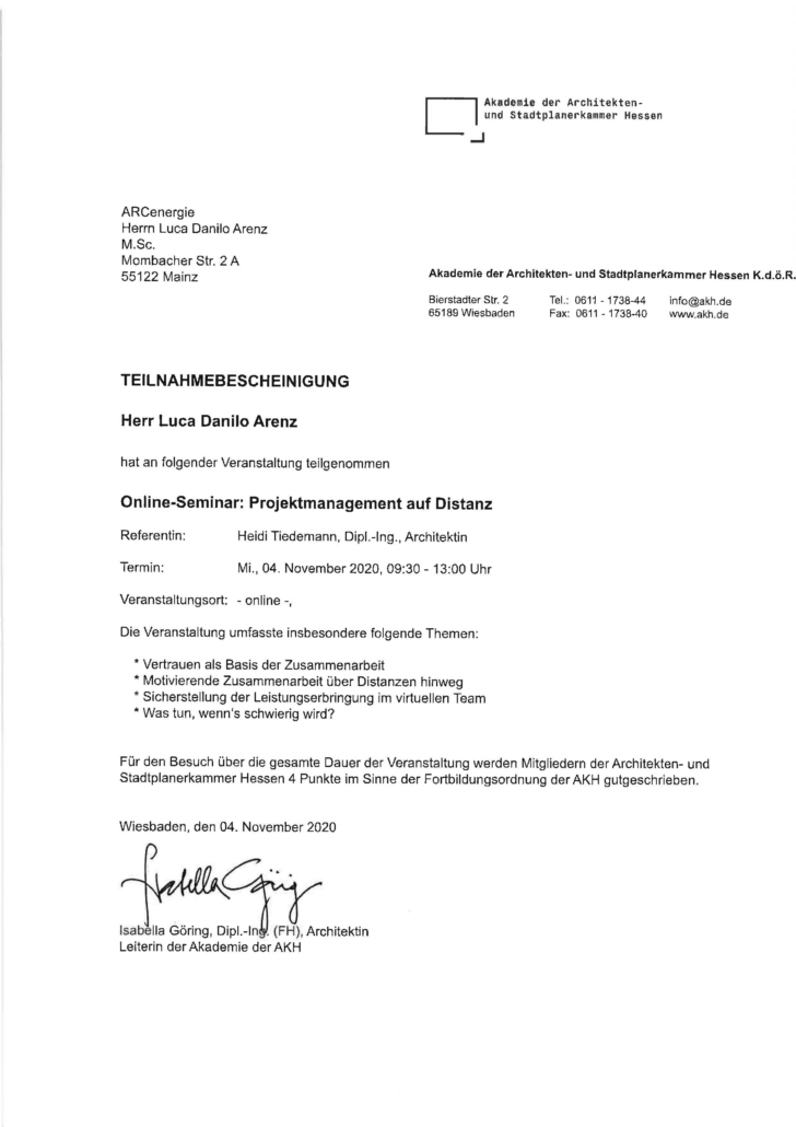 Uns bei ARCenergie ist es wichtig immer Up-to-date zu bleiben. Darum besuchen wir regelmäßig Fortbildungen, Seminare und suchen den Austausch mit Kollegen und Kolleginnen. Eine Auswahl unserer Urkunden und Zertifikate finden Sie hier.